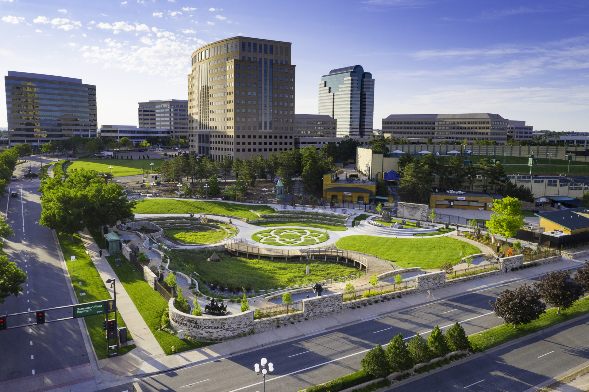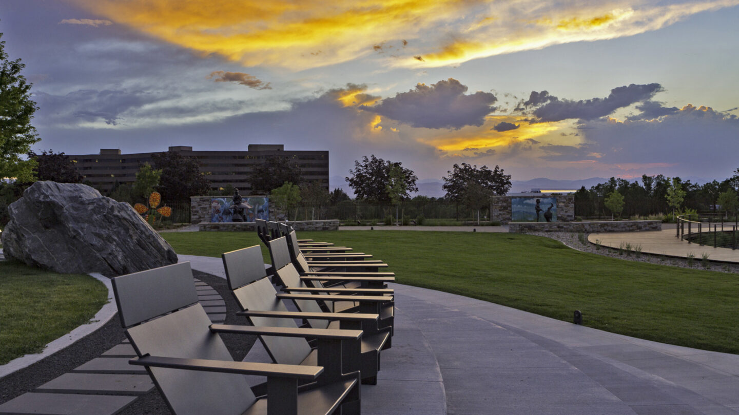 Marjorie Park accommodates art programming functions such as tours, arts education, temporary art installations, and community arts events as well as rentals for private and corporate events. The park also serves as the VIP entrance and amenity area for concerts at the neighboring Fiddler’s Green Amphitheater. Overall, the park provides a beautiful respite spot amid the surrounding urban framework.