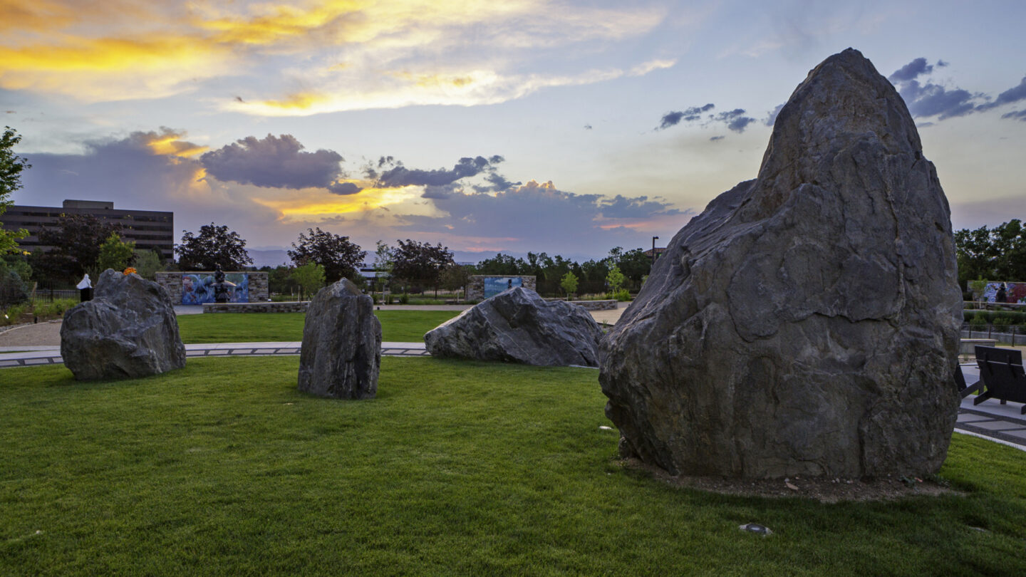 Marjorie Park – a primary venue of the Museum of Outdoor Arts (MOA) in Greenwood Village, Colorado – was created as an exclusive setting for a large portion of museum’s diverse, permanent sculpture collection. A recent renovation improved the site as a distinctive cultural experience, performance venue, and gathering space while upgrading the stormwater management system and improving park function through landscape architecture as art. The Denver office of national landscape architecture and planning firm Norris Design was selected for the endeavor. They collaborated closely with the museum, the project’s civil engineer S.A Miro, Inc., electrical engineer IMEG, stone masons from Rock and Company, and other subcontractors to develop the primary vision and final concept for the park. Local drainage and stormwater control requirements mandated that the site function as part of a regional system capable of handling 100-year flood elevations.