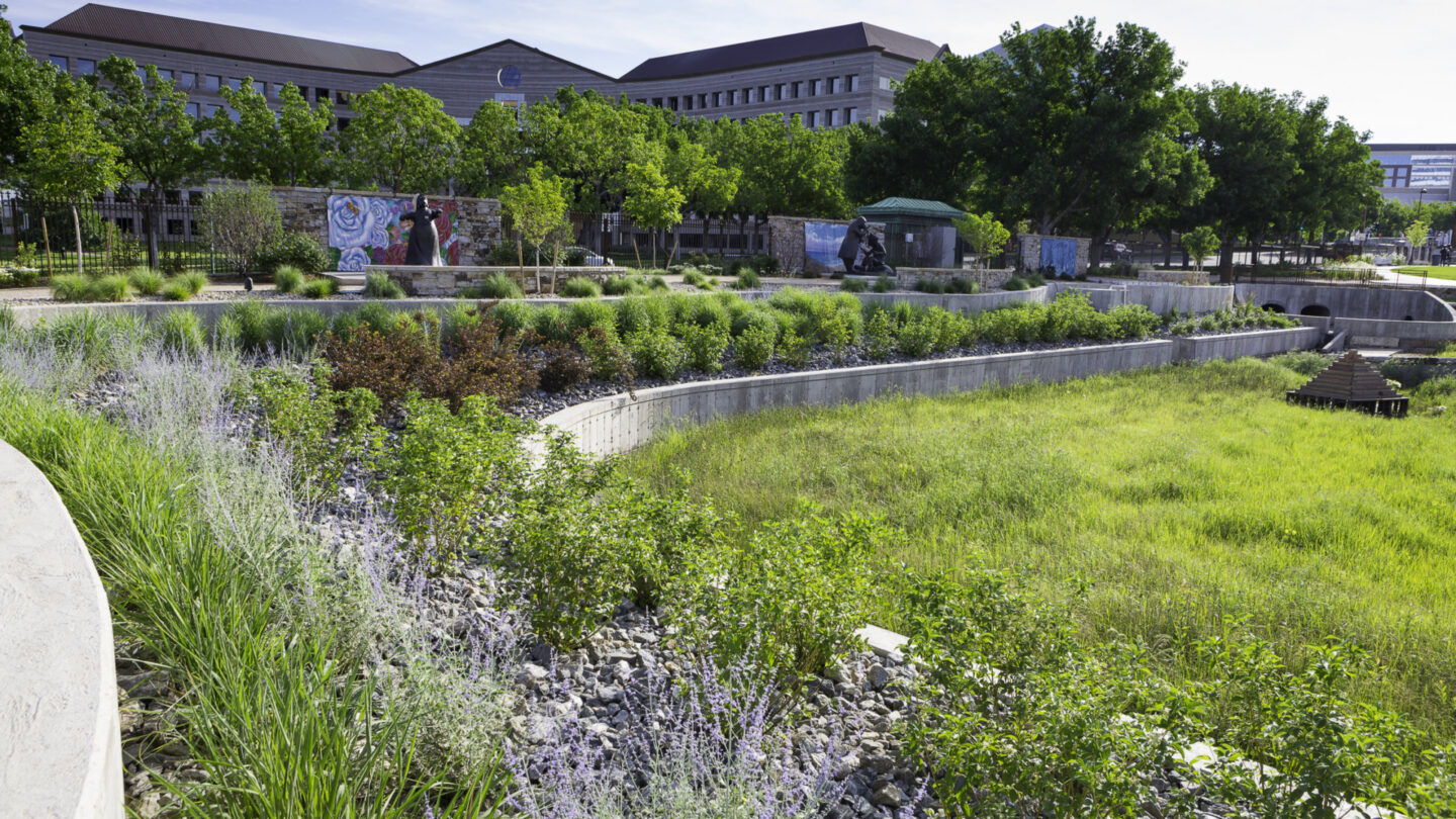 In the end, an underperforming portion of an urban drainage system was replaced with a high-functioning, vegetated detention basin that takes an ecological and educational approach to stormwater management, runoff, and water quality strategies. Furthermore, the space is useable and aesthetically pleasing: progressing from an area of little interest and high maintenance to a design element that enhances its surroundings. Visitors can better understand and interact with the dynamics of stormwater and how it is filtered onsite using the forebay, bioswales, and areas planted with native grasses and rain garden plant species that can accommodate periodic deluges and cleanse the water before it leaves the park.